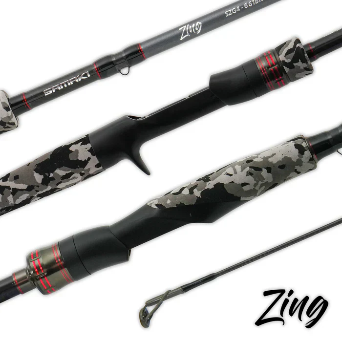The 4th generation of the legendary Zing series, the Samaki Zing Rod features HyperKinetic Nano+ fibre graphite blanks and Samaki exclusive, custom-designed reel seats for both spin and cast. It boasts signature camouflage hard EVA grips with red highlights and Fuji concept “O” guides. This versatile series includes models tailored for Estuary, Inshore, Travel, Egi, and Surf, ensuring there's a perfect Zing rod for every angler.